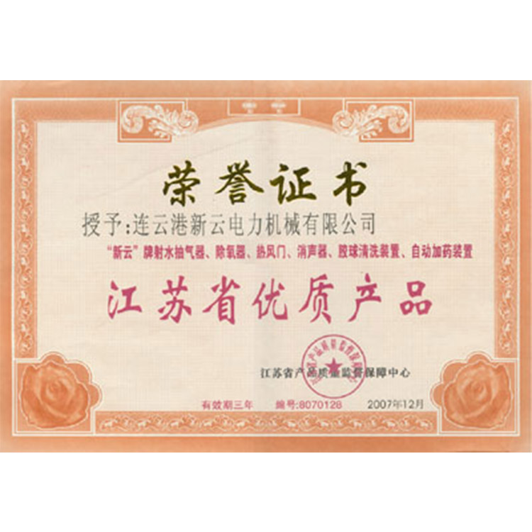 江苏优质产品 荣誉资质 2007-12-01 永久