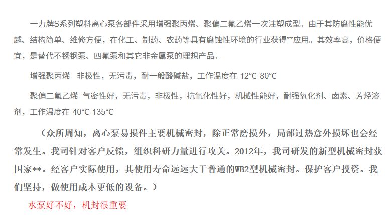 如果您在使用中遇难到过这样的问题,推荐您使用一力牌聚丙烯离心泵,我司目前生产的聚丙烯离心泵S40、S50、S80及S100系列均使用我司自行研发的**机封,经过多位客户的试用,冷却效果更好,使用寿命更长,能够很大程序上避免发生机封冷却不到位,损坏设备的情况。(售价不变)