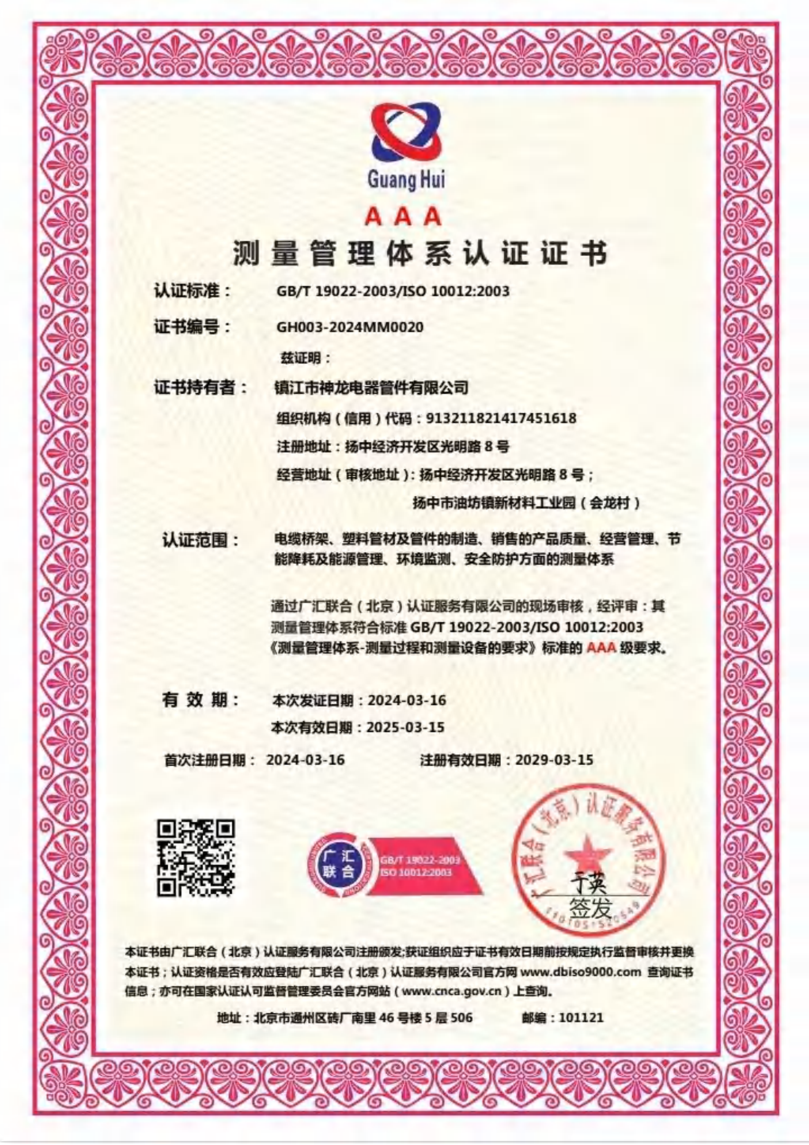 测量管理体系认证证书 由广汇联合(北京)认证服务有限公司 2024-03-16 2025-03-15