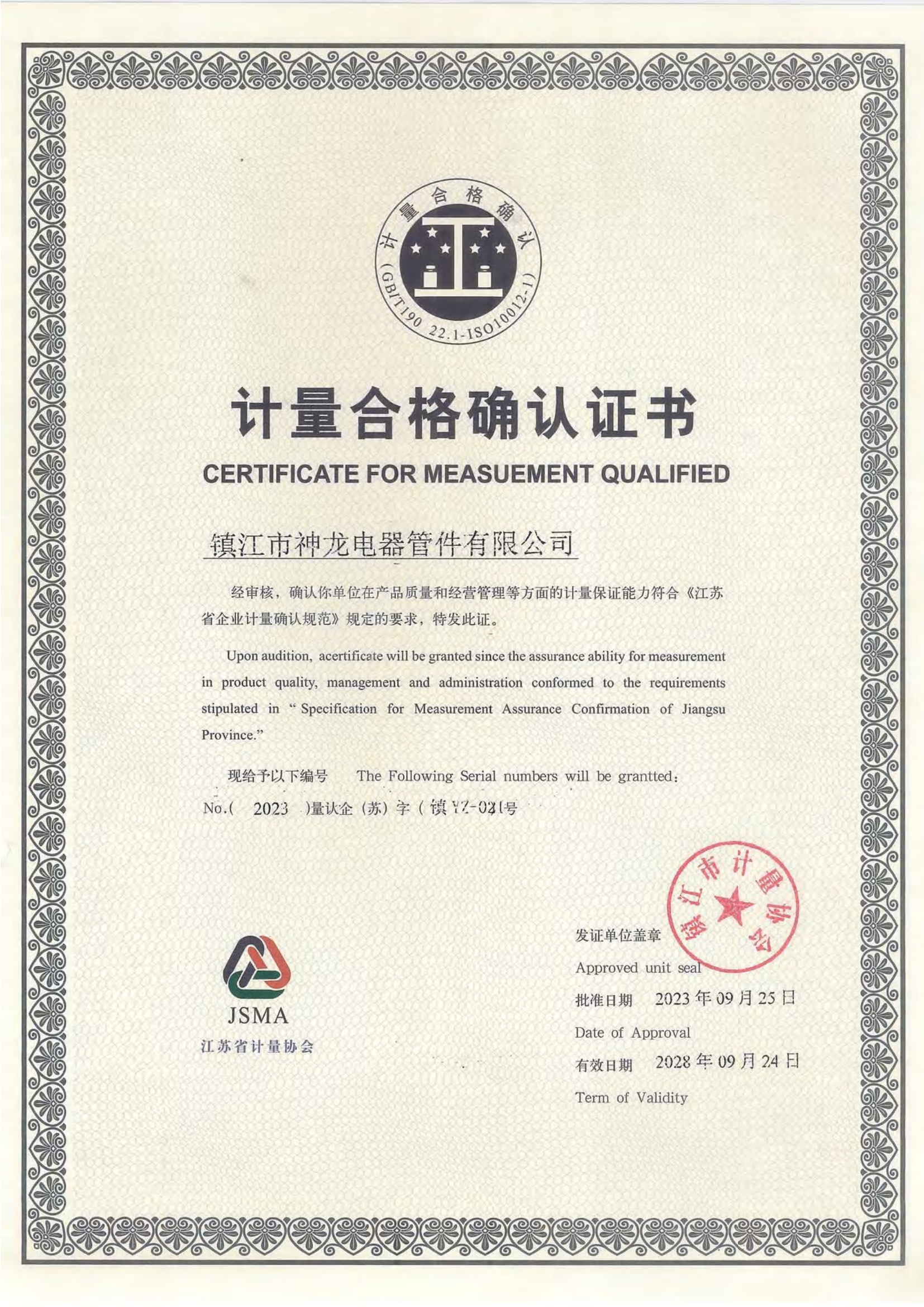 计量合格确认证书 江苏省计量协会 2023-09-25 2028-09-24