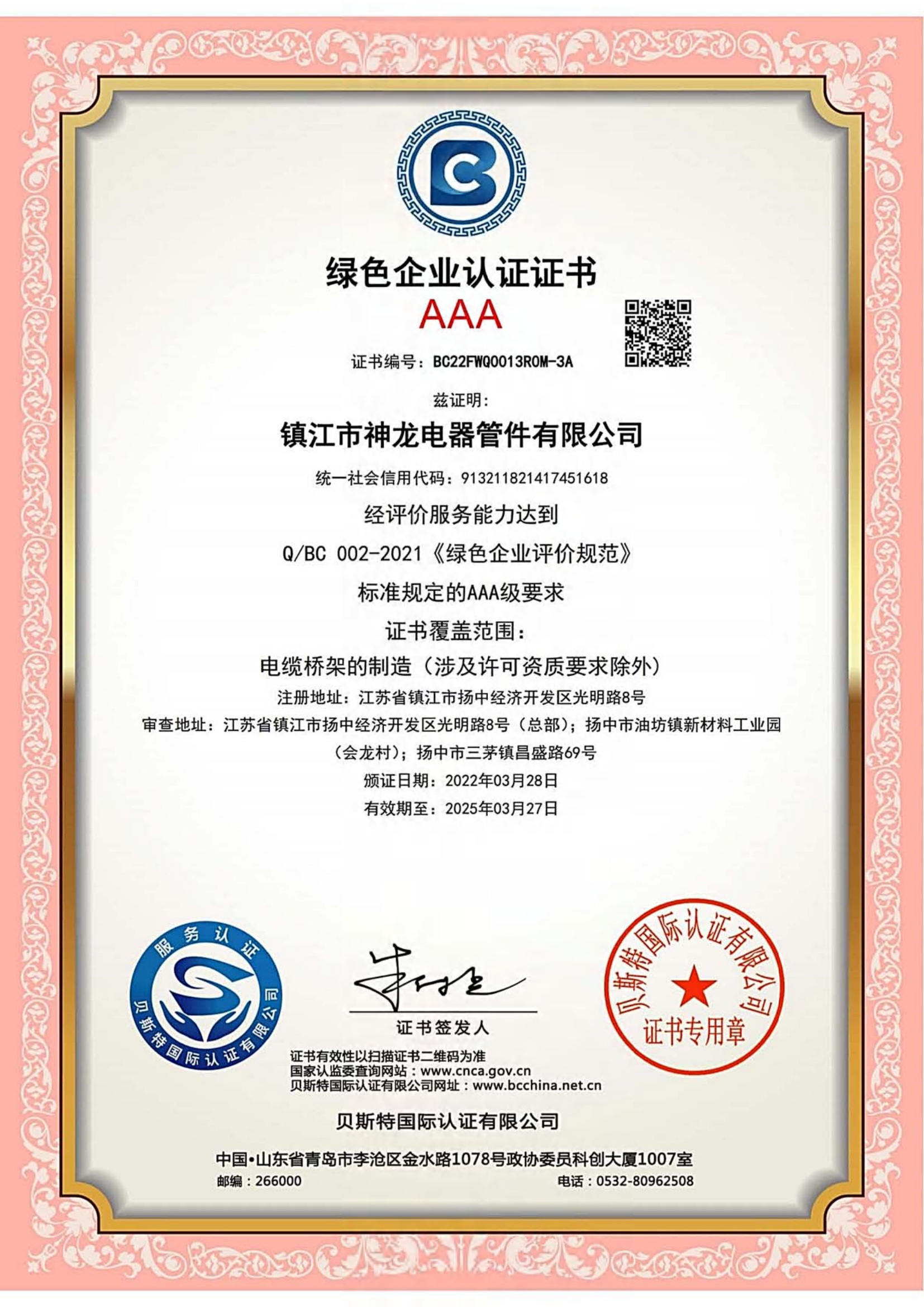 绿色企业认证证书 贝斯特国际认证有限公司 2022-03-28 2025-03-27
