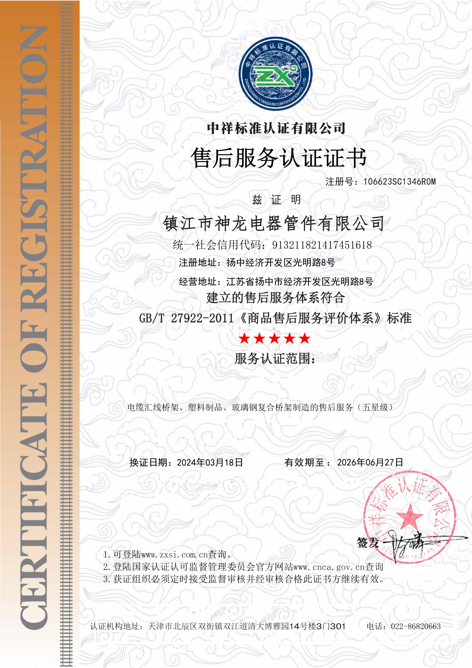 售后服务认证证书 中祥标准认证有限公司 2024-03-18 2026-06-27