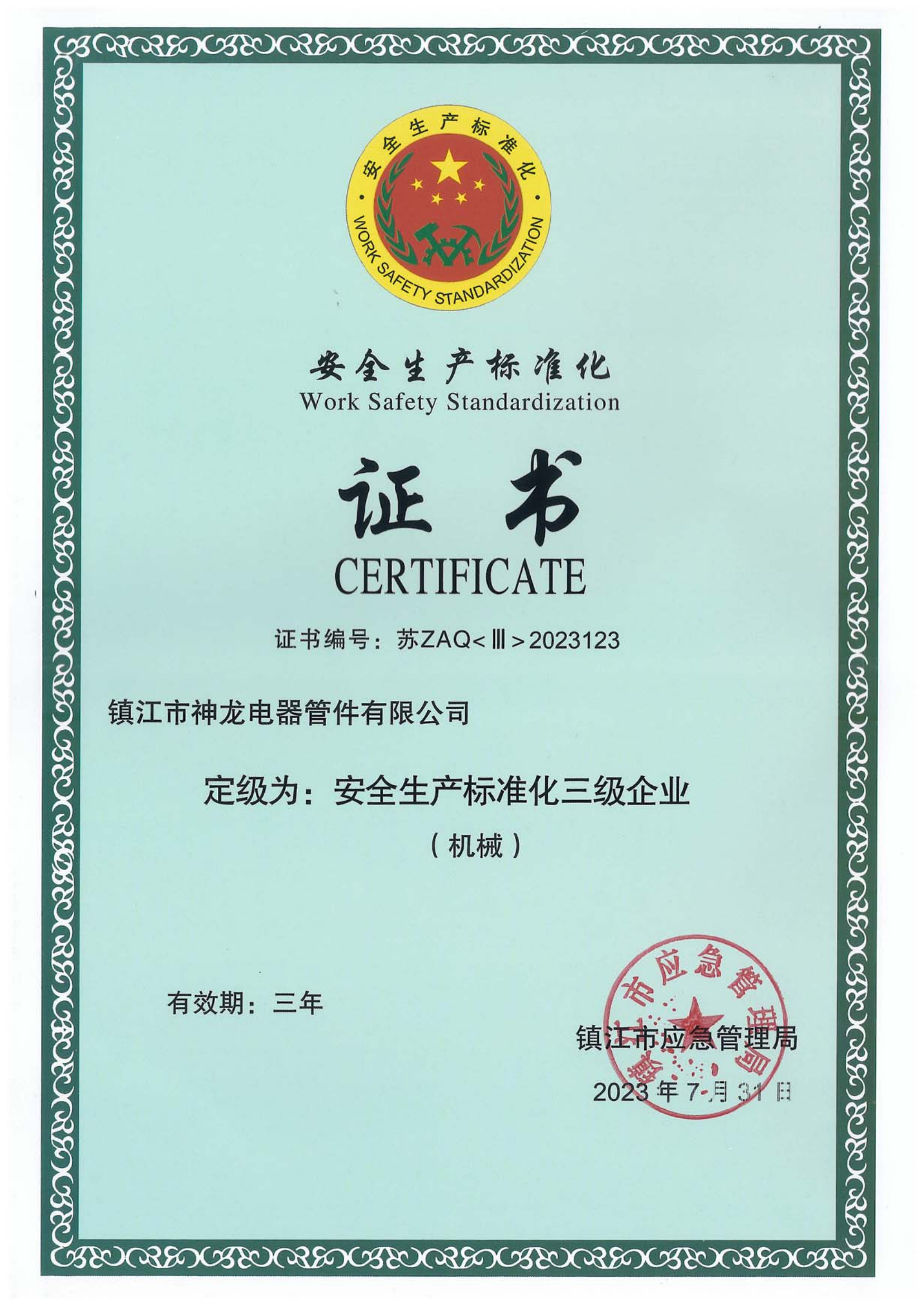 安全生产标准化三级企业(机械) 镇江市应急管理局 2023-07-31 2026-07-30