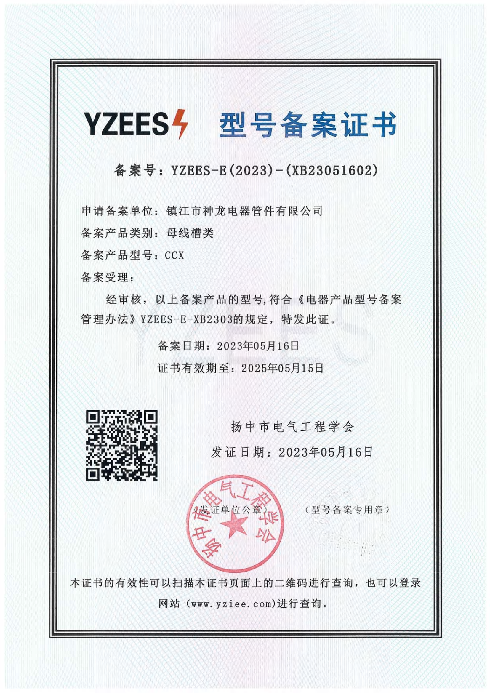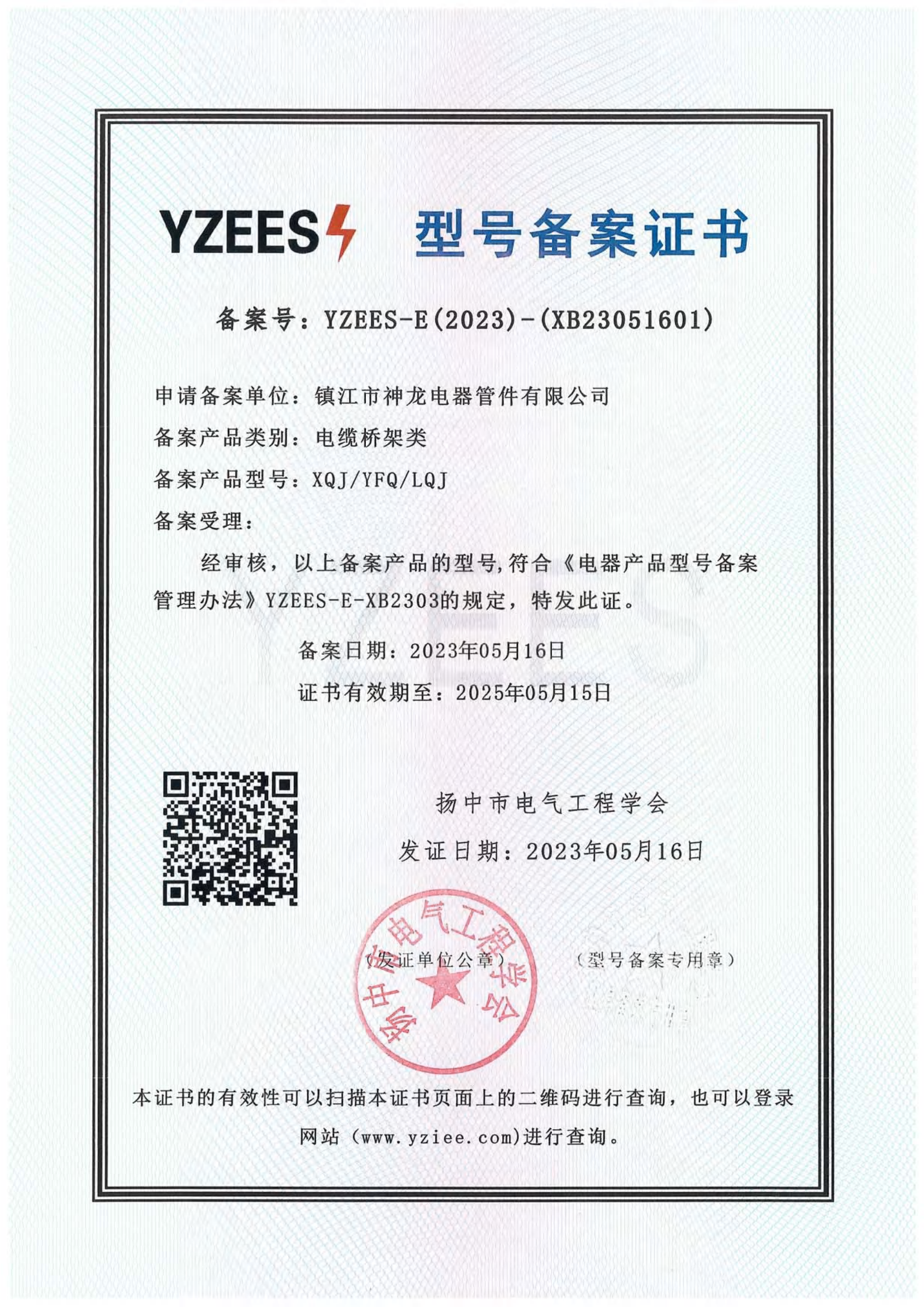 型号备案证书(电缆桥架类) 扬中市电气工程学会 2023-05-16 2025-05-15