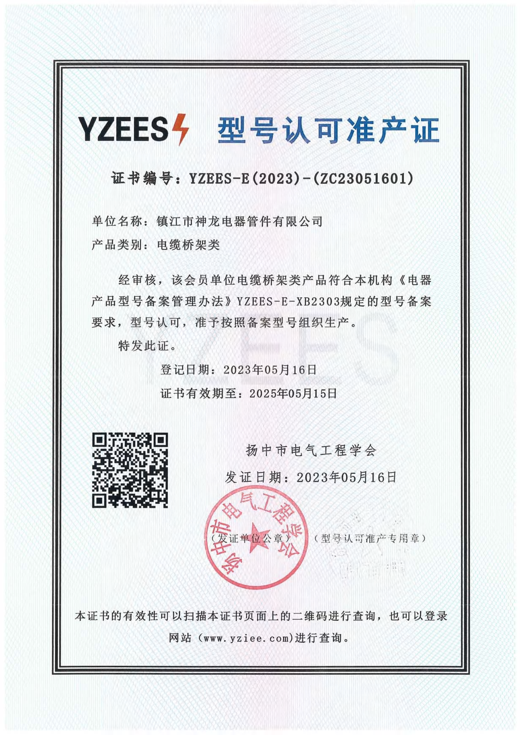 型号认可准产证(电缆桥架类) 扬中市电气工程学会 2023-05-16 2025-05-15