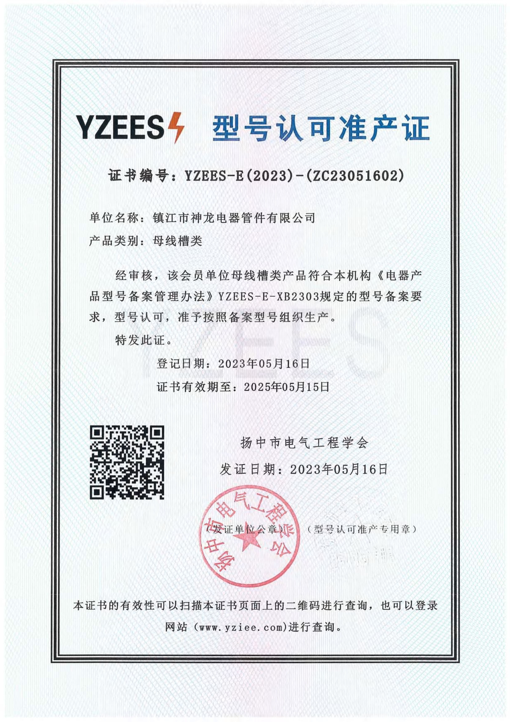 型号认可准产证(母线槽类) 扬中市电气工程学会 2023-05-16 2025-05-15